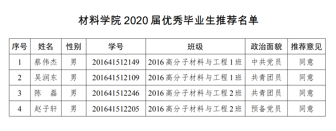 根据学校学工部、学生处通知要求,经个人申报、毕业班级充分讨论及班委会推荐,学院学工办审核并报学院党政联席会议研究,拟推荐2016级高分子材料与工程蔡伟杰等4名毕业生为永利集团2020届优秀毕业生。现予以公示。