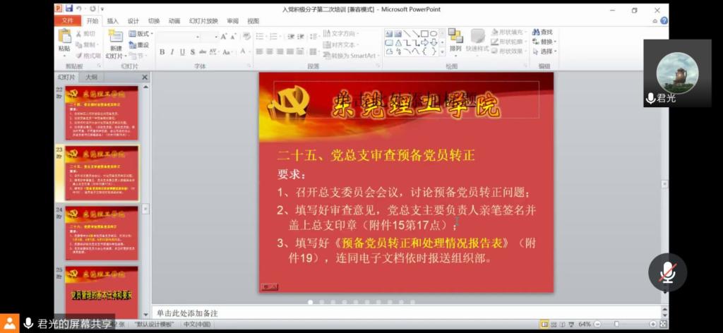 2020年6月11日下午16时30分,yl7703永利集团第四次党课腾讯会议进行网上授课,由yl7703永利集团的君光书记授课,课程主题为:入党条件程序和要求,及入党手续,25名积极分子准时参加党课。