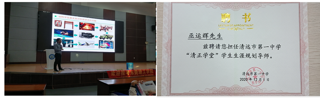 2020年12月1日,我校材料学院巫运辉博士、许伟娜博士前往优质生源基地清远市第一中学开展送课活动招生宣讲活动。清远市第一中学戴主任热情地介绍了学校的整体情况,历年在高考中取得优异成绩。巫运辉博士给该校学子送上《中国制造2020-新材料与科技强国》为主题的精彩课程。课后,同学们热情洋溢地提问,表示要好好努力学习,为国家科技奉献自己的一份力量。