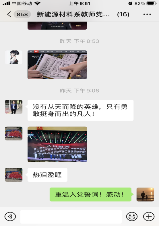 收看《榜样5》专题节目后,党员们备受感动和鼓舞,纷纷在支部的微信群上将触动自己的画面截图分享,并将自己的所悟所感也一同发到群上与大家分享交流。他们表示,在抗击新冠肺炎疫情的过程中,广大党员冲锋在抗疫一线,以自己的生命在诠释一名优秀的共产党员应有的风姿。作为高校的一名党员,在今后的工作和生活中,也要把学习榜样精神与开展党史学习教育结合起来,以更加饱满的工作热情和务实的工作作风投入到教育事业当中,争做担当作为的好榜样。