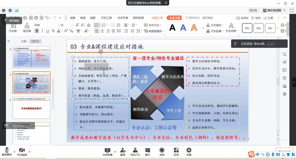 为了贯彻落实学校关于“深化课堂教学改革,提升课程育人质量”决策部署与学院思政建设的要求,2022年3月24日,材料学院高分子系通过腾讯会议视频的方式,召开了“专业与课程建设中面临的瓶颈短板及其对应破解举措”专题研讨,会议由系主任李坤泉主持,高分子系全体教师参加。