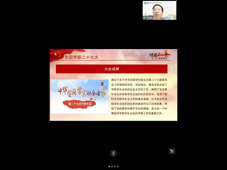 会议伊始,文锦枢老师为同学介绍中国共产主义青年团的发展历程,他强调青年运动是共产主义运动中重要的一部分工作,是中国共产党引领中国人民决胜全面建成小康社会和实现中华民族伟大复兴的中国梦的强大动力。随后文锦枢老师介绍了全国学联二十七大的大会成果,并与参会学生分享了习近平总书记在中国人民大学考察时发表的重要讲话的学习心得。他动员广大青年学生坚定跟党走、奋进新时代,为党和国家事业发展作出新的更大的贡献。