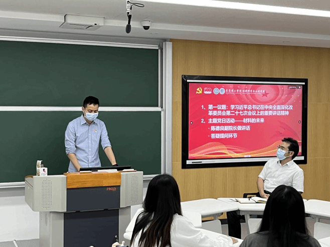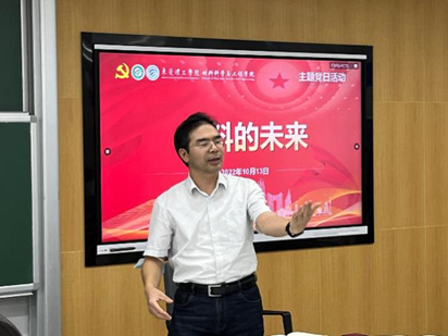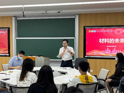 紧接着,材料学院党支部开展了“材料的未来”主题党日活动。本次党日活动特邀陈德良副院长就材料学院各专业未来就业、考研等以及当今热门材料话题进行分享讲话。陈德良副院长以当今地方社会发展为背景,分析阐述了材料专业对经济社会发展的重大促进作用及光明前景,并以个人成长经历激励广大党员同志们要把握时代脉搏,努力克服困难,夯实专业知识,为我国材料的发展添砖加瓦,为党和国家做出贡献,实现个人的最大价值。