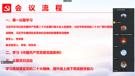 第一议题由李坤泉同志领学。第一项,由李坤泉同志领学“习近平总书记在中国共产党第二十次全国代表大会上的报告”。他指出,以习近平同志为核心的党中央统筹中华民族伟大复兴战略全局和世界百年未有之大变局,以伟大的历史主动精神、巨大的政治勇气、强烈的责任担当,统揽伟大斗争、伟大工程、伟大事业、伟大梦想,团结带领全党全军全国各族人民有效应对严峻复杂的国际形势和接踵而至的巨大风险挑战,以奋发有为的精神把新时代中国特色社会主义不断推向前进。第二项,李坤泉领学“习近平参加党的二十大广西代表团讨论时的重要讲话精神”。他指出,党的二十大报告进一步指明了党和国家事业的前进方向,是我们党团结带领全国各族人民在新时代新征程坚持和发展中国特色社会主义的政治宣言和行动纲领。第三项,李坤泉领学了“习近平在瞻仰延安革命纪念地时的重要讲话精神”。习近平总书记指出,延安是中国革命的圣地、新中国的摇篮。从1935年到1948年,党中央和毛泽东等老一辈革命家在延安生活和战斗了13年,领导中国革命事业从低潮走向高潮、实现历史性转折,扭转了中国前途命运。巍巍宝塔山,滚滚延河水,延安用五谷杂粮滋养了中国共产党发展壮大,支持了中国革命走向胜利。李烁、张东东两位同志在学习感悟分享表示,党的二十大指明了党和国家事业的前进方向,对高校教师来说,是一次精神上的洗礼,更是为自己终生奋斗目标指明方向。