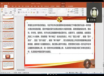 首先,汪文龙同志领学了习近平总书记二O二三年新年贺词、学习了中央政治局民主生活会会议精神、习近平总书记在学习贯彻党的二十大精神研讨班开班式上的重要讲话精神。
