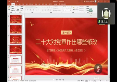 接着,汪文龙书记带领与会党员认真学习新修订的《中国共产党章程》。会议指出,党的二十大通过的党章修正案,适应全面建设社会主义现代化国家、全面推进中华民族伟大复兴的新形势新任务,在保持总体稳定的基础上实现了党章又一次与时俱进。会议要求要经常温习党章、严格遵守党章、坚决维护党章、在工作中严格要求自己,以党章为镜,争做符合习近平新时代中国特色社会主义思想的优秀共产党员。