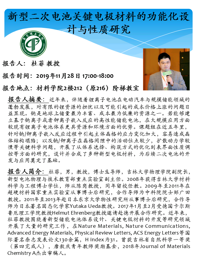 讲座通知:新型二次电池关键电极材料的功能化设计与性质研究