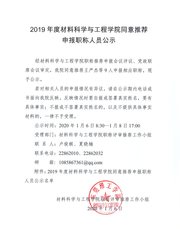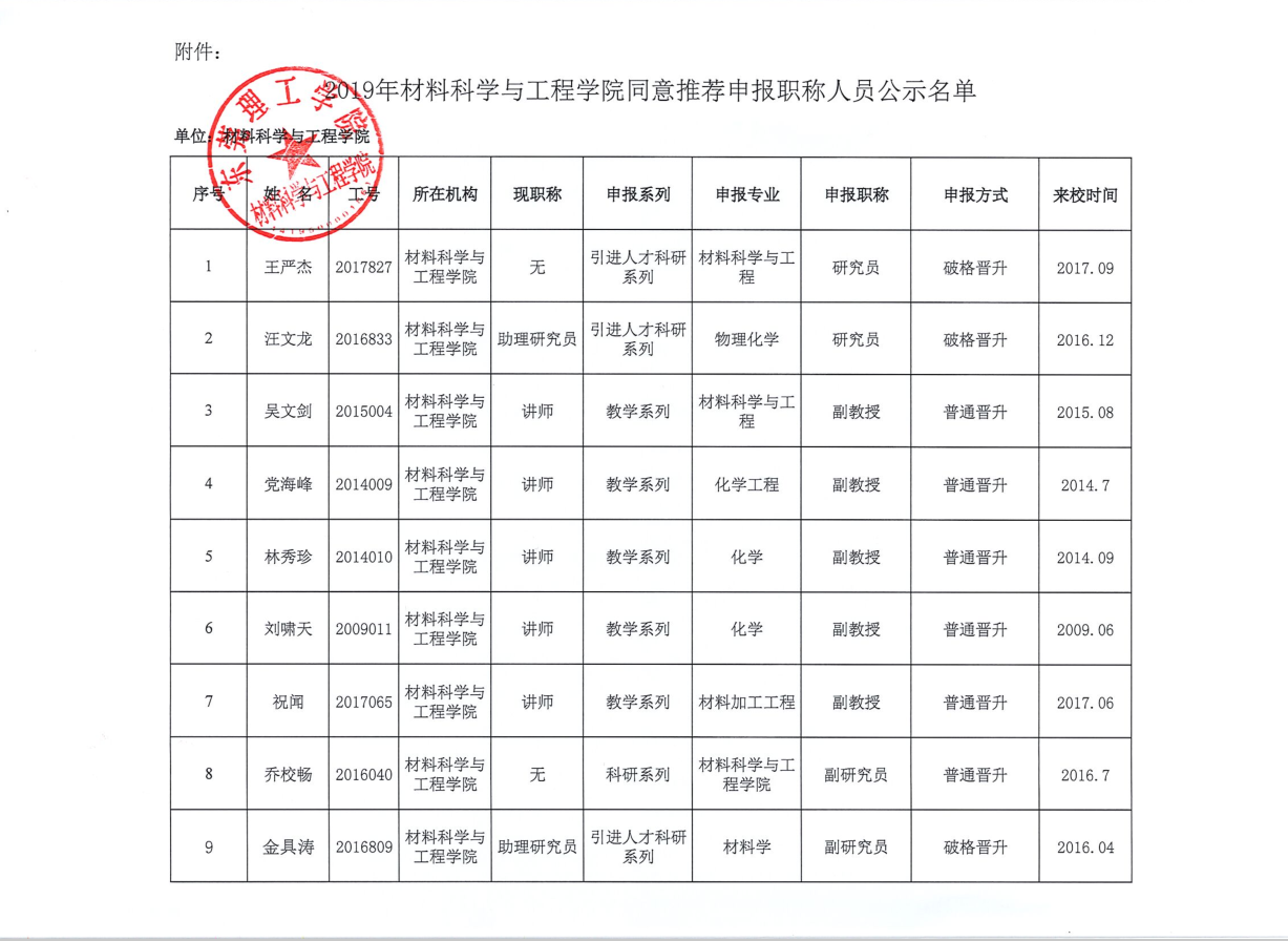 材料学院申报职称人员材料公示及评审推荐人员公示名单