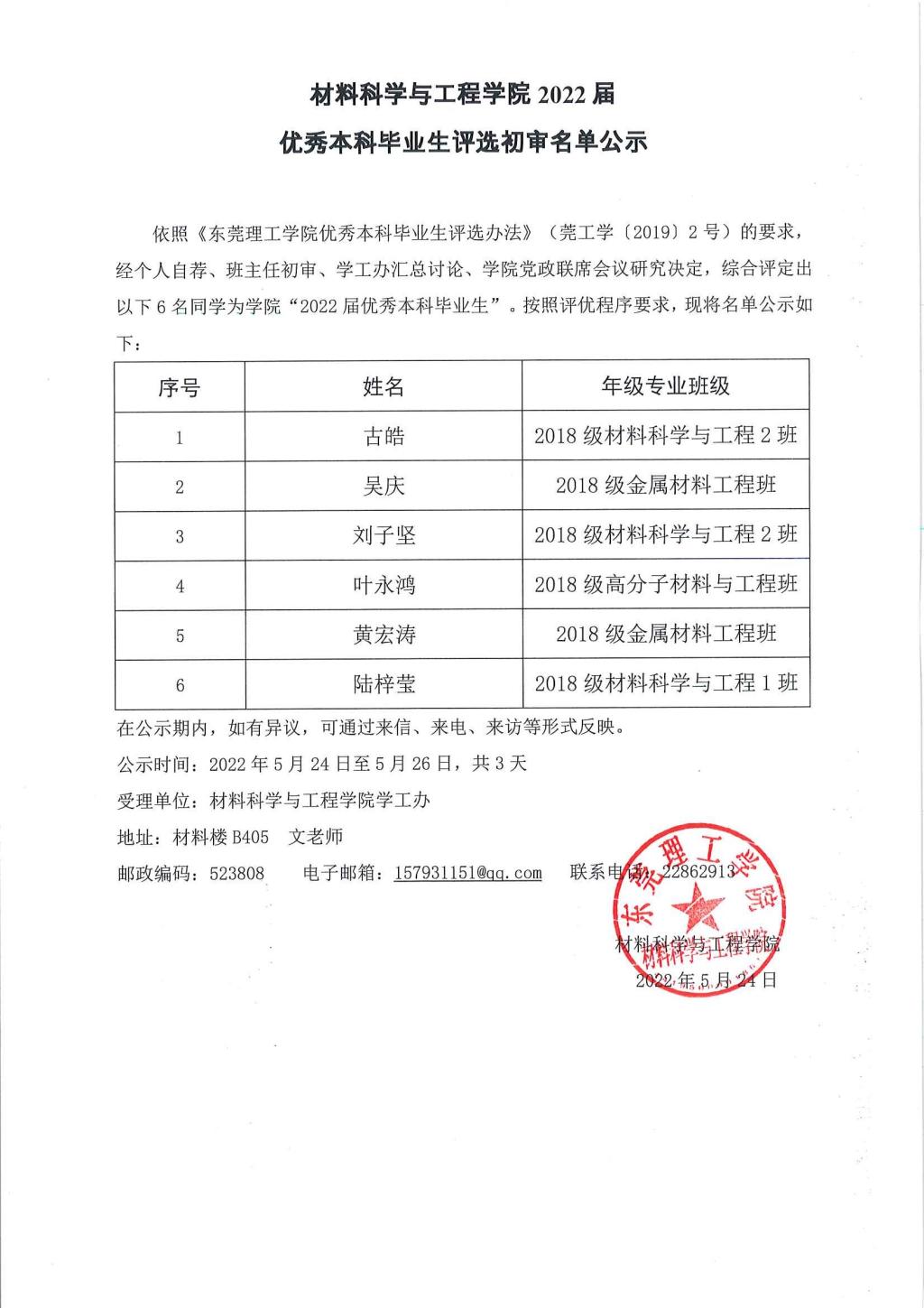 2022届优秀本科毕业生评选初审名单公示