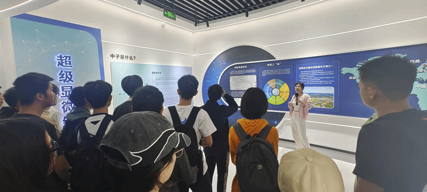 赵丹丹老师首先对中国散裂中子源的立项过程、建筑分区情况、科学设施功能、园区未来规划和战略意义等方面作了简单介绍。随后在科普展厅中,赵丹丹老师根据各区域展示内容,向在场师生详细介绍了加速器、靶站与谱仪等设备与技术以及大科学装置的运行原理,阐述了中国散裂中子源在地方科技合作与产业化方面做出的重大贡献。