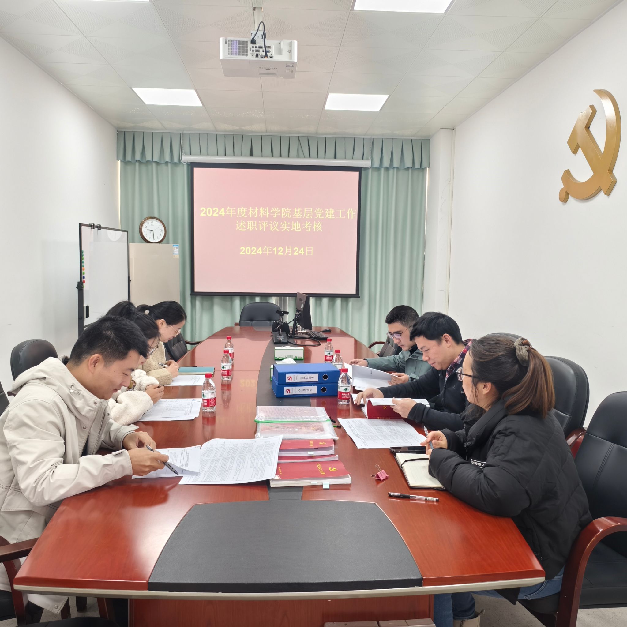 2024年12月24日上午,材料学院党委在材料楼4B410开展基层党建工作述职评议考核实地核查工作。核查小组以落实支部“第一议题”、“三会一课”等为重点核查内容,现场认真查阅相关档案资料和有关记录,深入分析各党支部党建工作完成情况,据实考评打分。