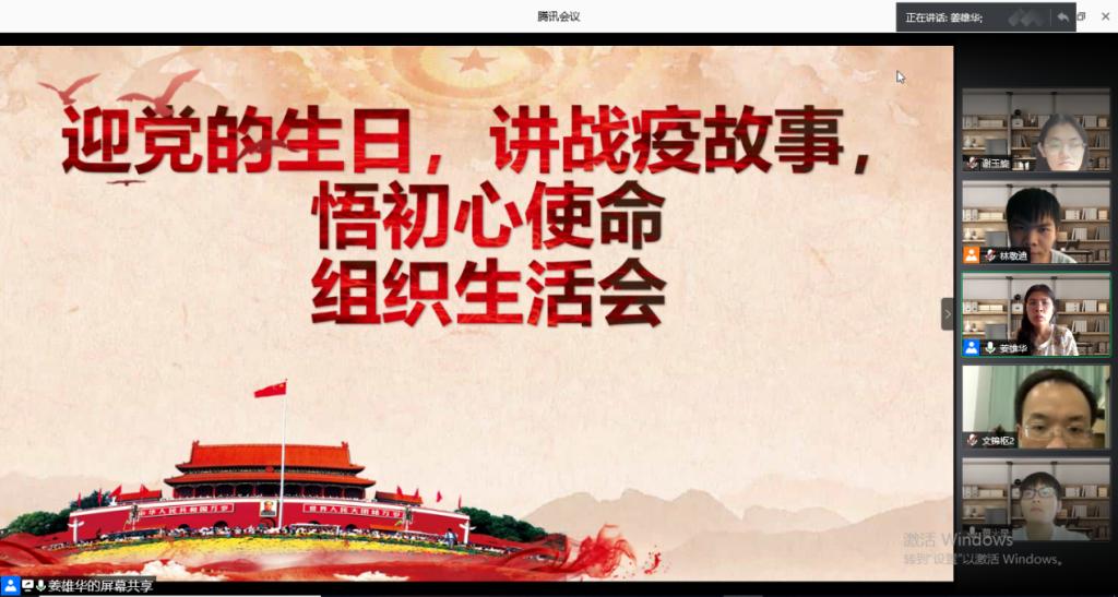会议第三项,开展“迎党的生日、讲战役故事、悟初心使命”组织生活会。首先姜雄华书记表示疫情还没结束,大家还要注意,坚持防护;同时也分享对电影的观后感。然后徐老师、文老师、党员们都接连发表感想。每个党员都分享了自己近期的想法和学习,最后也一致表示会奉献自己的力量去建设好学生支部,组织交代的任务会尽全力的完成。