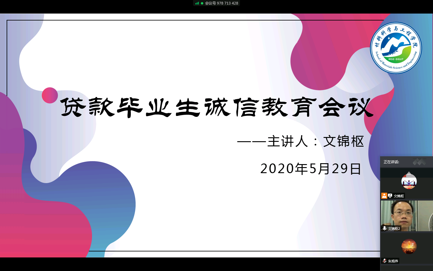 2020年5月29日下午,我院在线上召开2020届贷款毕业生诚信教育会议,会议由学院辅导员文锦枢主讲。