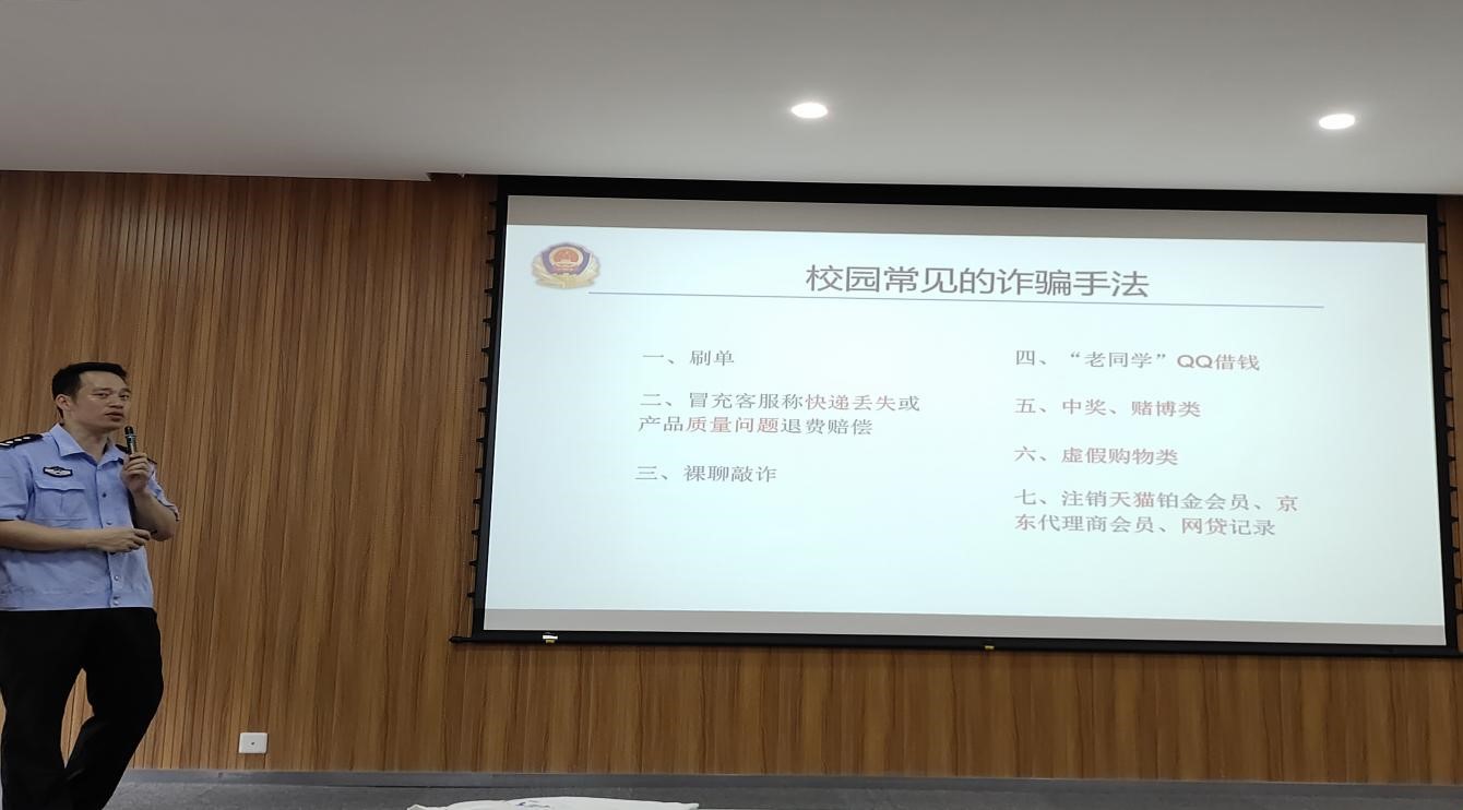 近期校园网络诈骗案件频发,诈骗分子通过各种途径来进行诈骗。为了使同学们更加清楚地了解诈骗分子的诈骗手段,苏东阳警官给学生们详细普及了诈骗的常见特点:利用网络招兼职刷单进行诈骗、假冒电商客服工作人员或者店铺商家称快递丢失或产品质量问题进行退费赔偿、裸聊敲诈、冒充QQ好友进行诈骗、中奖、赌博类、虚假购物类、通过私发链接让学生注销天猫、京东和淘宝等会员和网贷记录。并就相关诈骗特点,展开了讲解,普及相关防诈骗知识和辨识技巧。