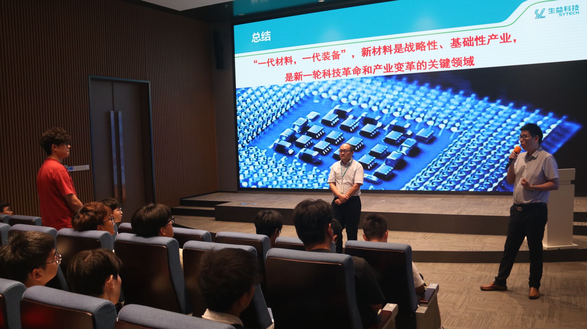 接着,师生参加了企业举办的专题讲座。现场,肖经理介绍了生益科技公司的产业布局,强调公司十分重视科研投入和人才培养,同时出台诸多激励措施予以支持。会上,柴总也具体讲解了覆铜板的相关知识,分析了印刷电路板(PCB)及其配件研制和改进历程,讲述了覆铜板的构成、工艺流程、未来发展方向等。最后的互动交流环节,在场学生积极提问,企业代表认真解答。